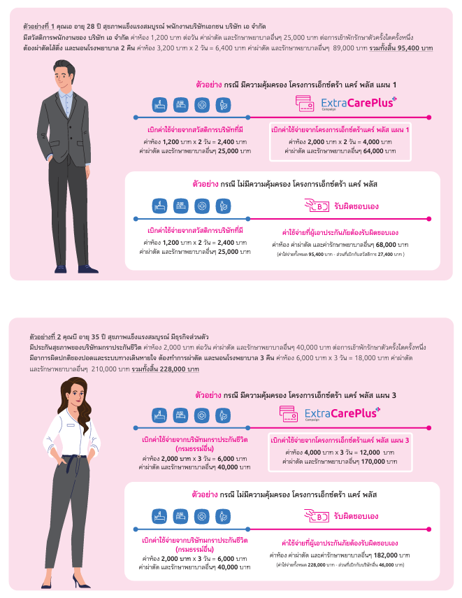 ประกันสุขภาพเหมาจ่ายเอ็กซตร้าแคร์พลัส คุ้มครองค่ารักษาพยาบาลส่วนเกิน เหมาะสำหรับท่านที่มีสวัสดิการประกันสุขภาพอยู่แล้วเช่น สวัสดิการประกันกลุ่ม สวัสดิการราชการ ประกันสุขภาพบริษัทอื่น แต่ค่าห้องและค่ารักษาพยาบาลส่วนเกินไม่พอ