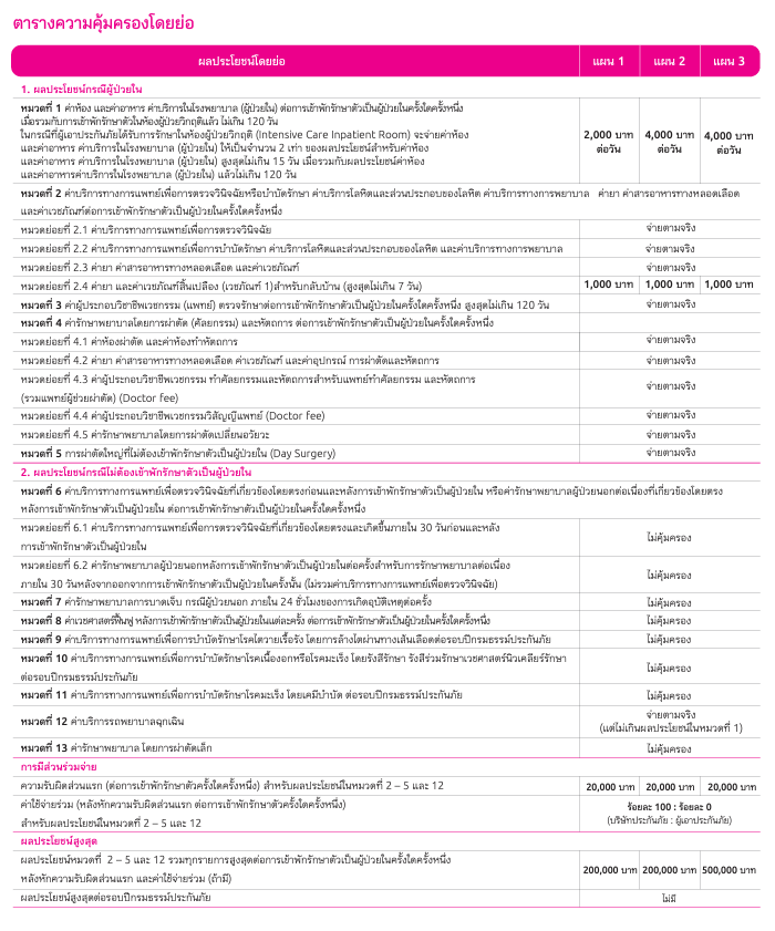 วงเงินความคุ้มครองสูงสุด 500,000 บาท ต่อการเข้าพักรักษาตัวครั้งใดครั้งหนึ่ง