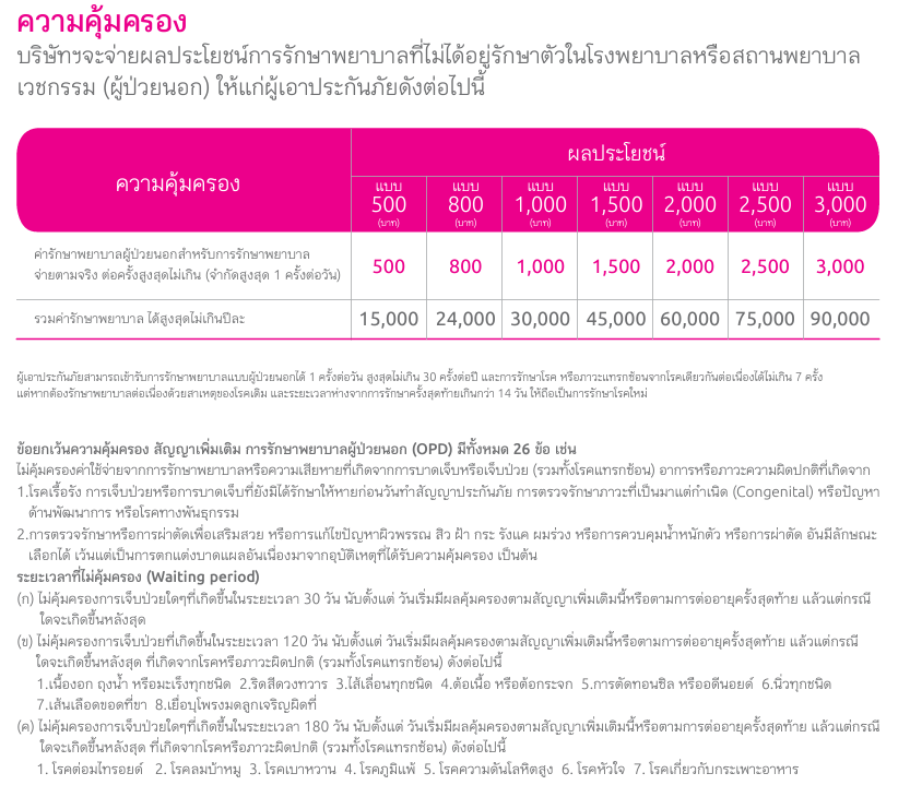 หมายเหตุ : * รายละเอียดผลประโยชน์ในประกาศคำสั่งนี้ เป็นเพียงการสรุปโดยย่อเท่านั้น ซึ่งการพิจารณาจ่ายผลประโยชน์ในกรณีต่างๆ ขึ้นอยู่กับ เงื่อนไข คำจำกัดความ และข้อยกเว้นของสัญญาเพิ่มเติม การรักษาพยาบาลผู้ป่วยนอก