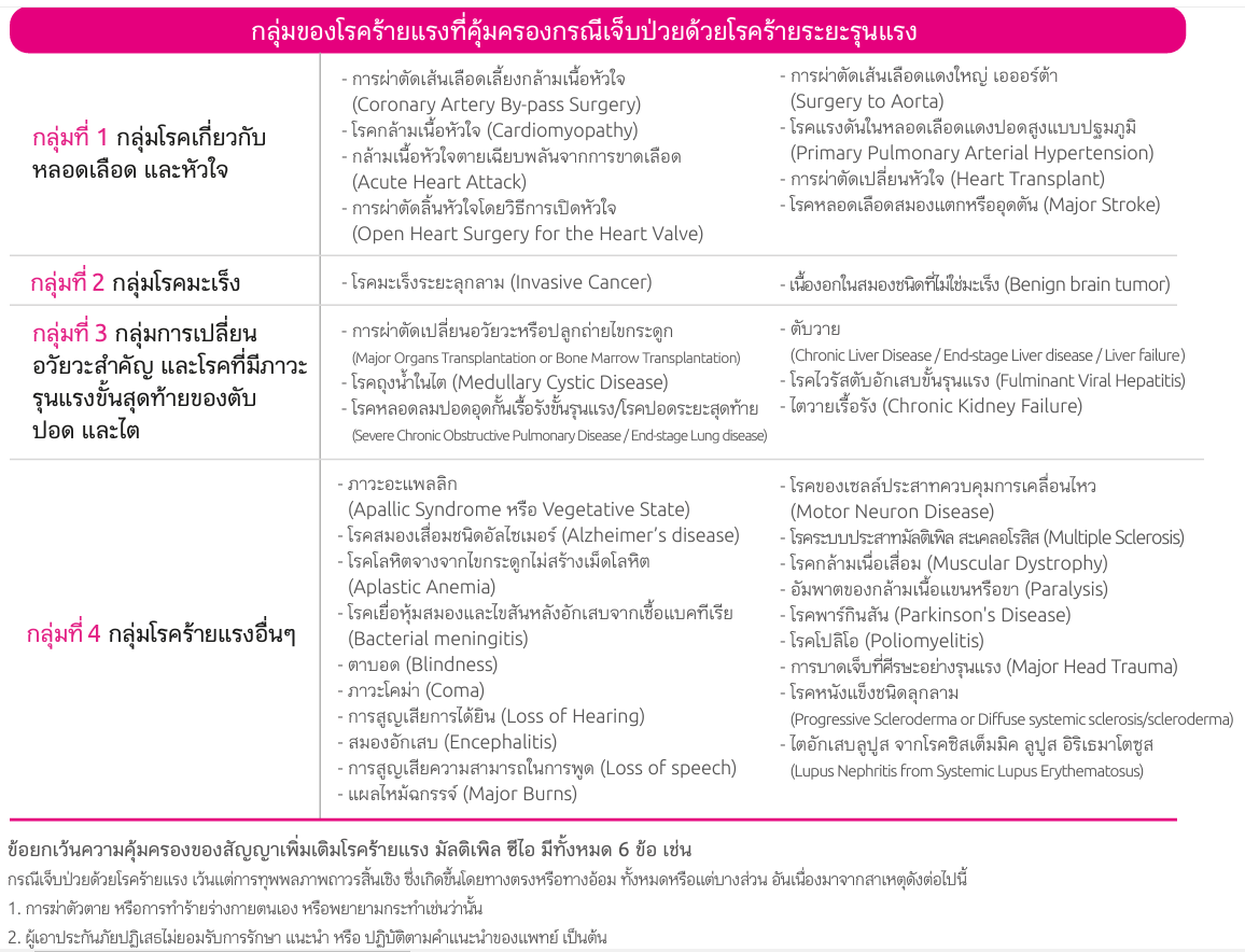 1. ความคุ้มครองของกลุ่มของโรคร้ายแรงที่มีการจ่ายจำนวนเงินเอาประกันภัยเนื่องจากการเจ็บป่วย หรือการผ่าตัดที่มีรายชื่อโรคนั้นอยู่จะสิ้นสุดลงโดยผู้เอาประกันภัยยังได้รับความคุ้มครองในโรคที่อยู่ในกลุ่มของโรคร้ายแรงกลุ่มอื่น ๆ