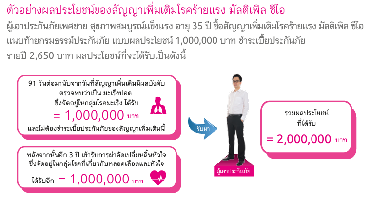 “ความคุ้มครอง” ในขณะที่สัญญาเพิ่มเติมยังมีผลบังคับผู้เอาประกันภัยจะได้รับความคุ้มครองตามเงื่อนไขข้อบังคับของสัญญาเพิ่มเติมนี้เมื่อผู้เอาประกันภัยได้รับการวินิจฉัยว่าเจ็บป่วยด้วยโรคร้ายแรงหรือได้รับการผ่าตัดตามความคุ้มครองโรคร้ายแรงตามคำจำกัดความของโรคที่ให้ไว้ในสัญญาเพิ่มเติมนี้ทั้งนี้หลังจากที่บริษัทได้รับหลักฐานทางการแพทย์ของการเจ็บป่วยหรือการผ่าตัดเพียงพอที่จะสามารถวินิจฉัยได้ บริษัทฯจะจ่ายเงินตามจำนวนเงินเอาประกันภัยของสัญญาเพิ่มเติมนี้ให้แก่ผู้เอาประกันภัยหลังจากที่บริษัทได้ทำการจ่ายจำนวนเงินเอาประกันภัยให้แก่ผู้เอาประกันภัยครั้งที่ 1 แล้วผู้เอาประกันภัยไม่ต้องจ่ายเบี้ยประกันภัยของสัญญาเพิ่มเติมนี้อีก สัญญาเพิ่มเติมฉบับนี้จะมีผลบังคับและให้ความคุ้มครองตามเงื่อนไขดังนี้