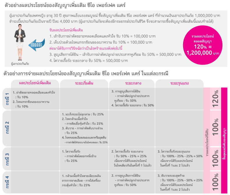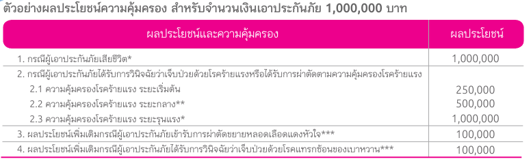 “ความคุ้มครอง” ในขณะที่สัญญาเพิ่มเติมยังมีผลบังคับผู้เอาประกันภัยจะได้รับความคุ้มครองตามเงื่อนไขข้อบังคับของสัญญาเพิ่มเติมนี้หากผู้เอาประกันภัยเสียชีวิตหรือได้รับการวินิจฉัยว่าเจ็บป่วยด้วยโรคร้ายแรงหรือได้รับการผ่าตัดตามความคุ้มครองโรคร้ายแรงบริษัทจะจ่ายผลประโยชน์ของสัญญาเพิ่มเติมนี้ให้แก่ผู้เอาประกันภัยหรือผู้รับผลประโยชน์แล้วแต่กรณี ดังนี้
