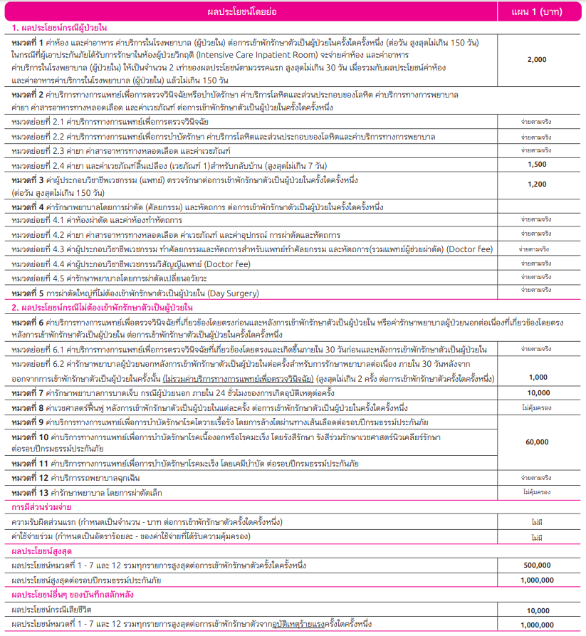 ในกรณีที่ผู้เอาประกันภัยต้องเข้ารับการพักรักษาเป็นผู้ป่วยใน บริษัทจะจ่ายผลประโยชน์ ดังนี้